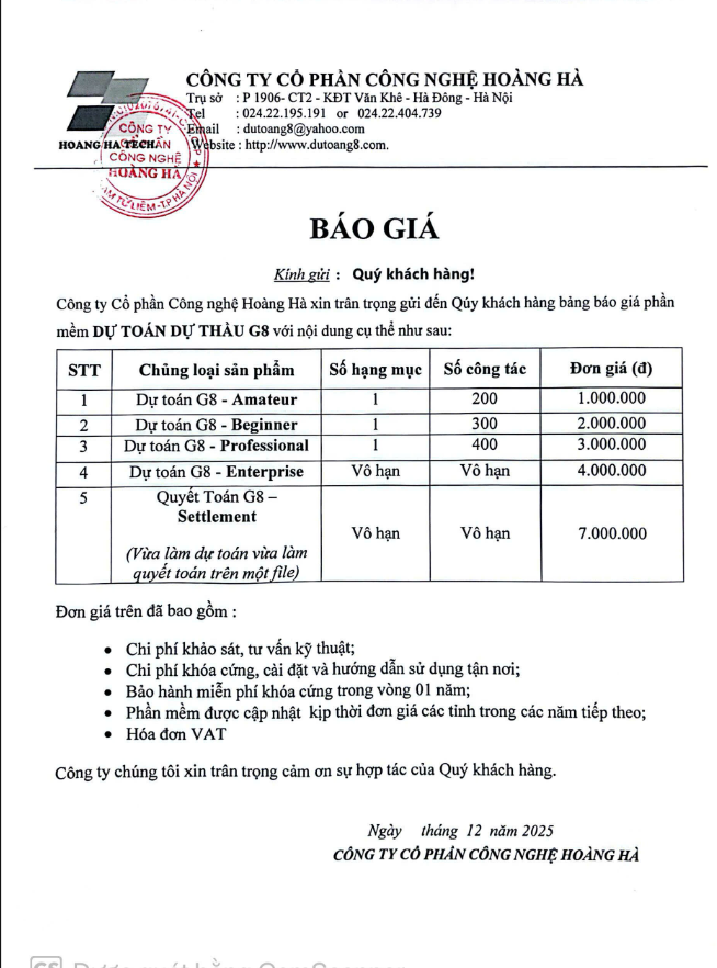 Phiên bản Dự toán G8 – Professional( bản giá rẻ) chạy 400 công tác, trên một hạng mục vừa làm dự toán, dự thầu. Cung cấp đầy đủ đơn giá, thông tư, nghị định mới nhất. Cung cấp đầy đủ đơn giá, thông tư, nghị định mới nhất. Bản quyền usb khóa cứng hoặc kích hoạt online